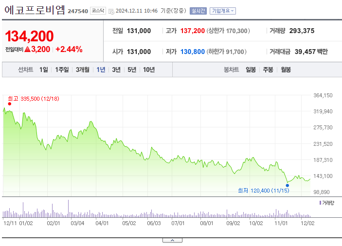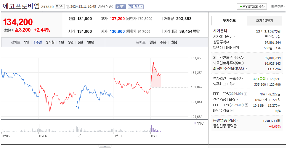 에코프로비엠의 현재 주가는 약 134,000원입니다.