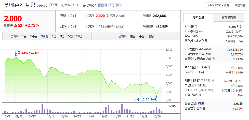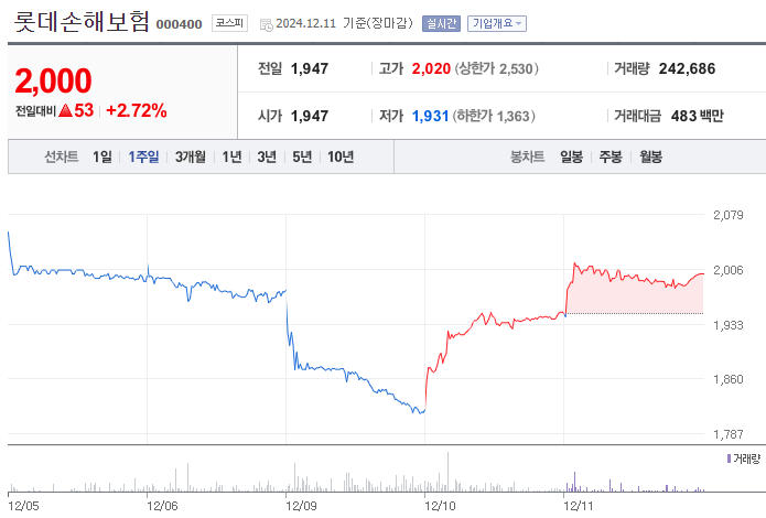 롯데손해보험의 최신 주가는 2024년 12월 11일 기준 약 2,000원입니다.