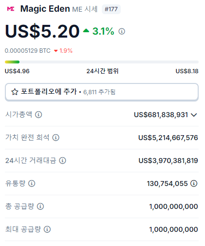 매직에덴(ME) 은 출시 초기 급격한 가격 변동을 겪었으며, 한때 13.10달러 까지 상승한 후 4.30달러까지 하락했습니다.