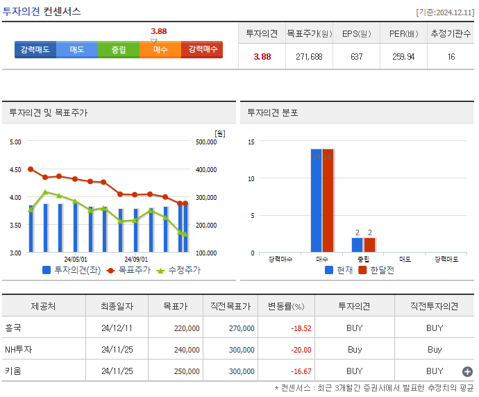 현재 증권사들의 평균 목표주가는 274,813원 정도에요.