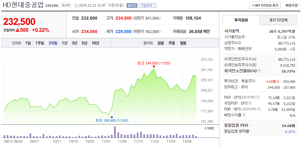 현재 주가는 2024년 12월 12일 기준으로 232,000원을 기록하고 있습니다.