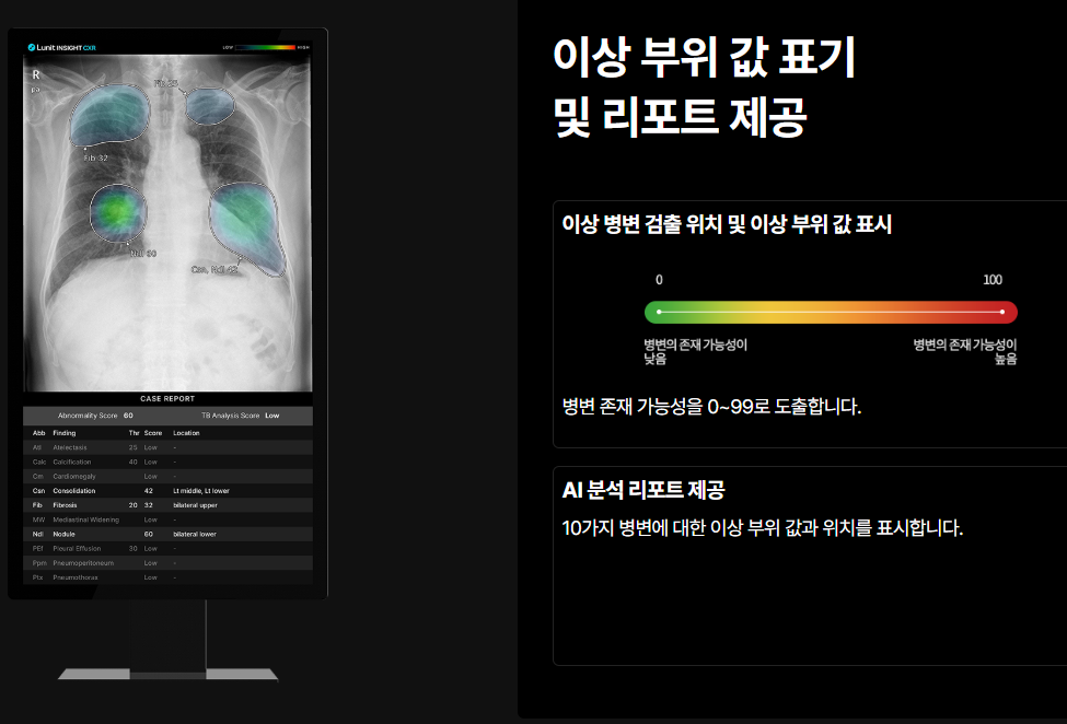 주요 제품으로는 흉부 X-ray 분석 AI 소프트웨어 'Lunit INSIGHT CXR'과 유방암 진단 보조 AI 소프트웨어 'Lunit INSIGHT MMG'가 있습니다.