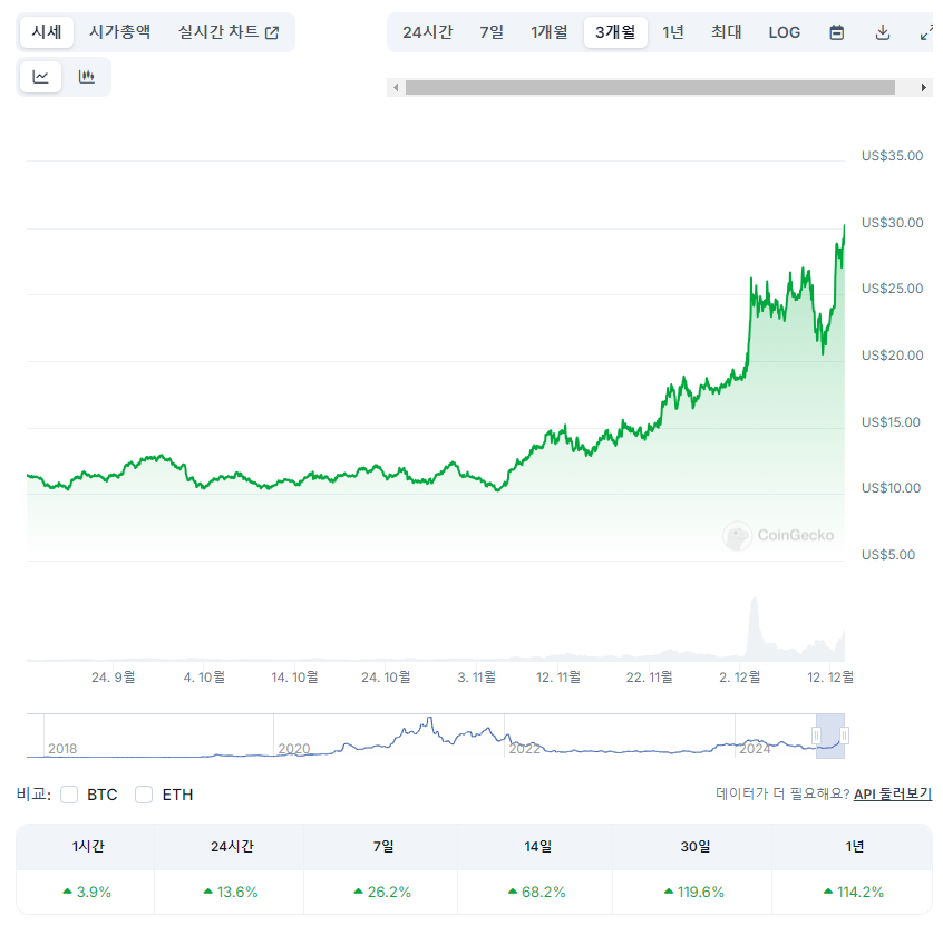 체인링크(LINK)의 현재 시세는 약 30달러입니다. 최근 30일 사이에 119% 상승했으며 일거래량은 60억달러입니다.
