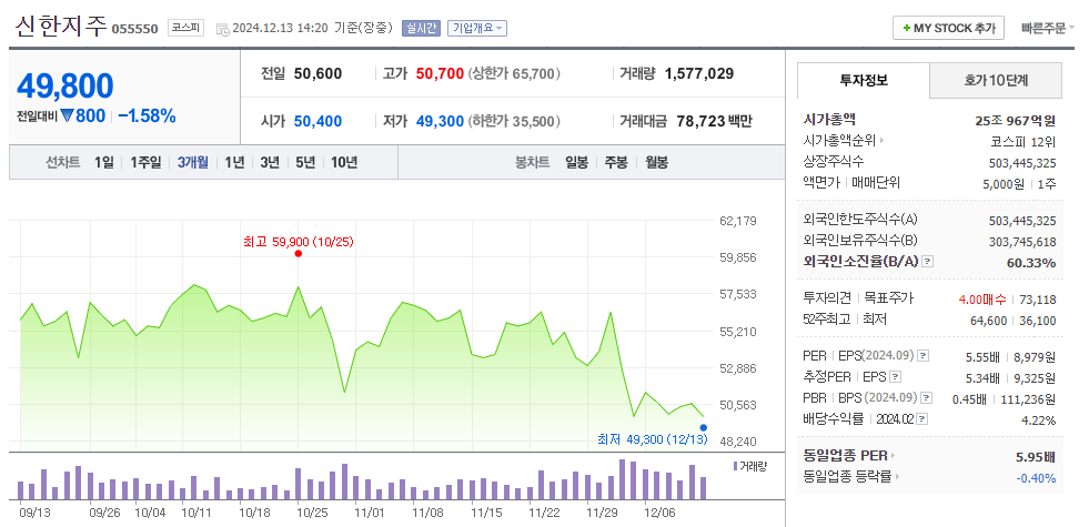 신한지주의 주가는 2024년 12월 11일 기준 약 50,000원입니다.