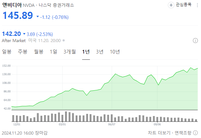 하지만 최근 몇 년 간 엔비디아의 주가가 급격하게 상승했기 때문에 시장의 변화에 따라 급등락 할 수 있습니다.