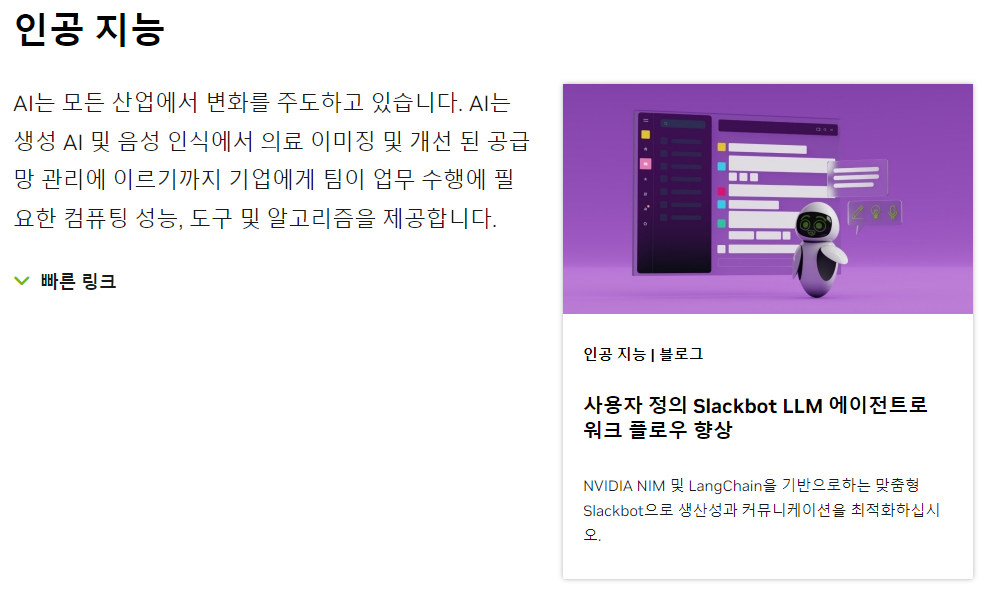 엔비디아는 GPU 설계 및 개발을 주력으로 하는 세계적인 기술 기업으로, 고성능 컴퓨팅, 게임, 자동차 산업, AI 분야에서 강력한 입지를 가지고 있습니다.