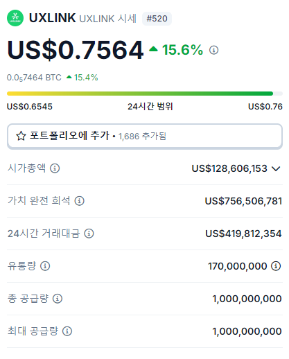 유엑스링크(UXLINK)의 현재 시세는 약 0.75달러 입니다.