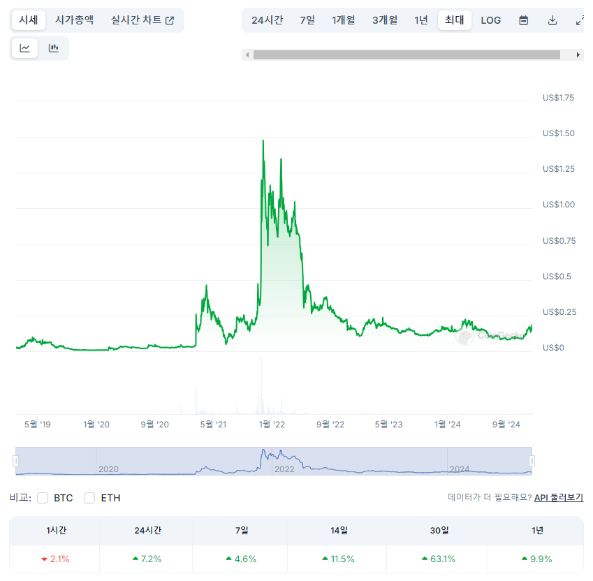 역대 최고가는 2021년 11월 1.65달러였고, 현재는 그 수준에서 크게 하락한 상태입니다.