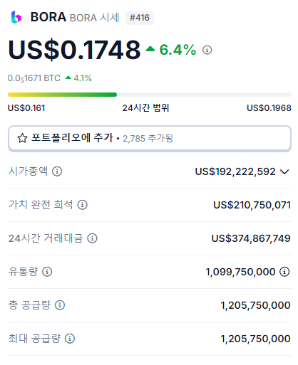 보라코인(BORA)의 현재 가격은 약 0.17달러 수준입니다.