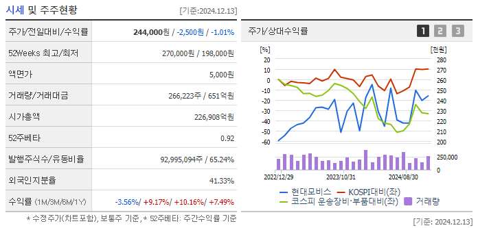 현대모비스의 주가는 2024년 12월 16일 기준 약 237,500원입니다.