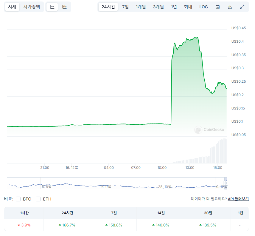 업비트 상장 소식 이후 24시간 동안 348.37% 급등해 코인마켓캡 기준으로는 333.79% 상승한 0.3803달러를 기록했습니다.