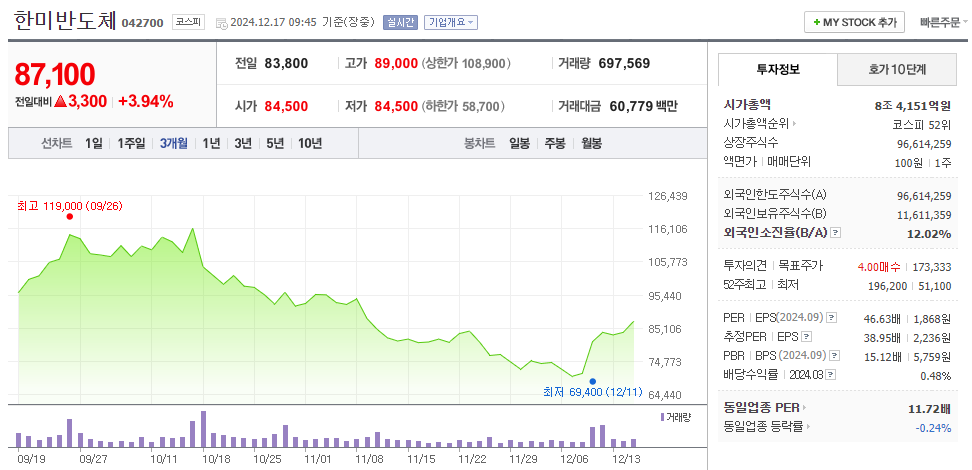 2024년 12월 17일 기준으로 한미반도체 주가는 약87,000원을 기록하고 있습니다.