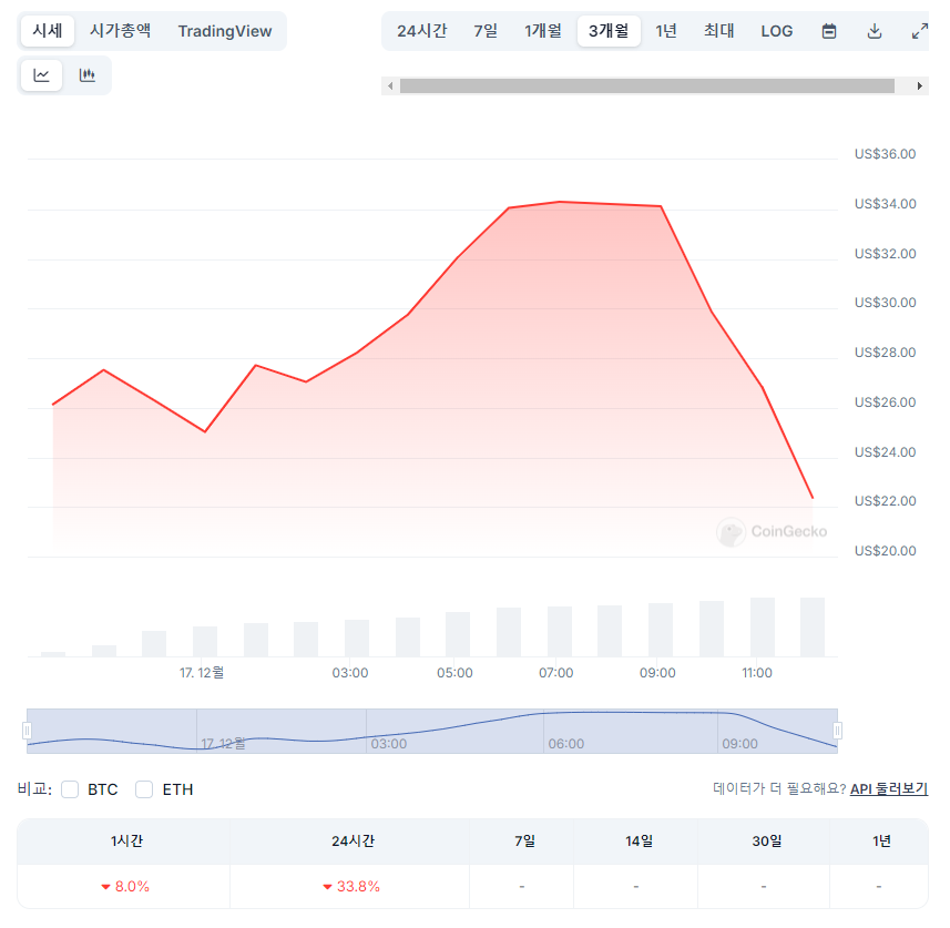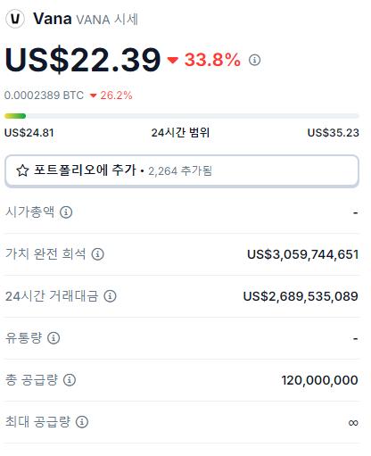 바나(VANA)는 약34달러까지 가격이 상승했다가 급격히 하락해 현재 시세는 약 22달러입니다.