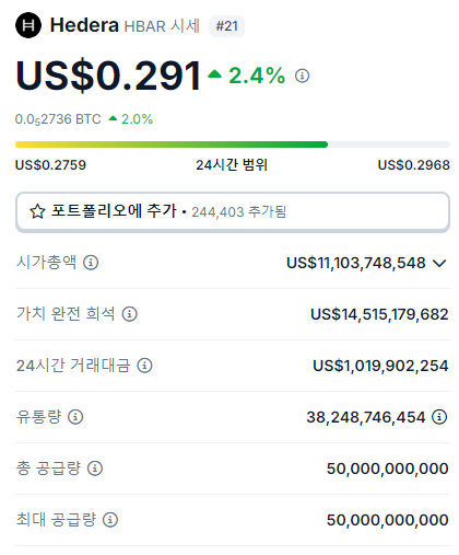 헤데라(HBAR)의 현재 시세는 약 0.29달러입니다.