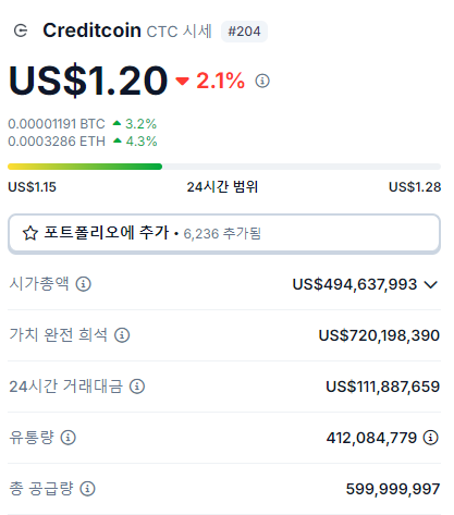 크레딧코인(CTC)의 현재 시세는 약 1.19달러입니다.