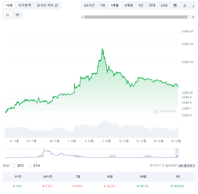 12월 6일 약 2.8 달러까지 큰 폭으로 상승했지만 그 이후로 하락세를 보이고 있습니다.